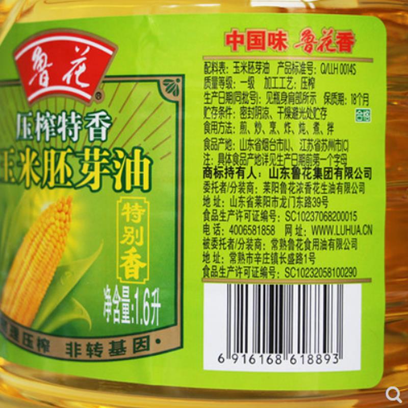 • 商品名称:鲁花压榨玉米胚芽油 1.6L/桶