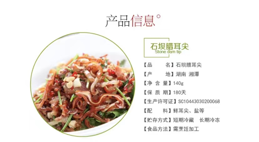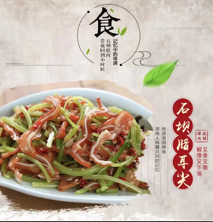 • 商品名称:石坝米糠腊耳尖140g湖南预制菜农家非烟熏香脆网红下酒菜小吃