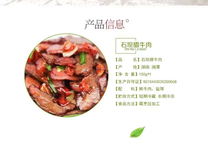 • 商品名称:石坝米糠腊牛肉150g湖南特产非烟熏咸香营养解馋预制菜实惠